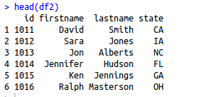 sqldf("SELECT COUNT(*) FROM df2 WHERE state = 'CA'") COUNT(*) 1 4 sqldf("SELECT df2.firstname, df2.lastname, df1.var1, df2.state FROM df1 INNER JOIN df2 ON df1.personid = df2.id WHERE df2.state = 'TX'") firstname lastname var1 state 1 David Spade -2.09 TX 2 Joe Montana 1.16 TX sqldf("SELECT df2.state, COUNT(df1.var1) FROM df1 INNER JOIN df2 ON df1.personid = df2.id WHERE df1.var1 > 0 GROUP BY df2.state") state COUNT(df1.var1) 1 AZ 1 2 CA 1 3 GA 1 4 IL 1 5 NC 1 6 NY 1 7 OK 1 8 SC 1 9 TX 1 10 VT 1